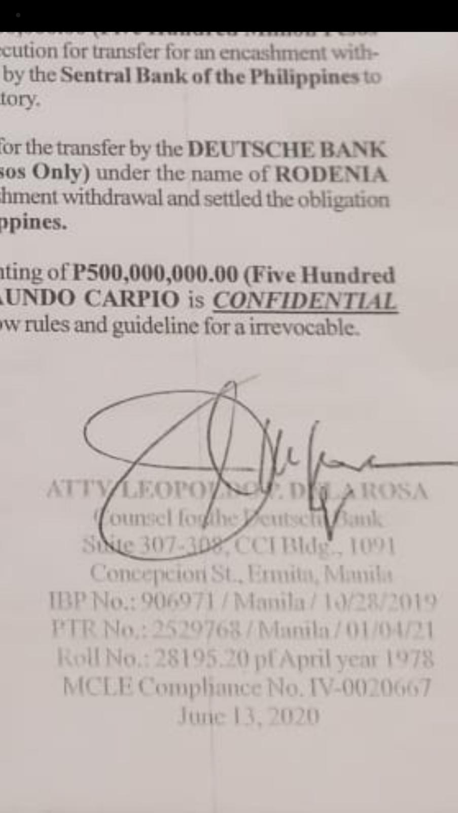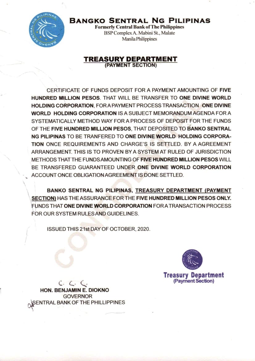 Rodenia Udaundo Carpio also has provided forged and fake documents under her company One Divine World Holdings Corp, claiming that Bangko Sentral Ng Pilipinas (BSP) has a “certificate of deposit for a payment amounting of FIVE HUNDRED MILLION PESOS”.