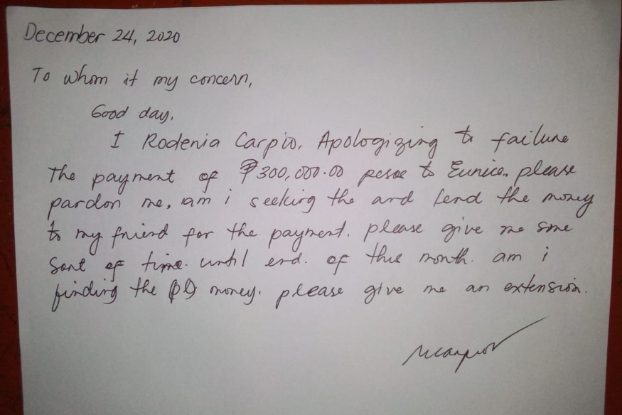 Rodenia Udaundo Carpio has been silent and avoiding direct communication with us. She then wrote a few Whatsapp messages promising to pay back the 300,000 PHP in full from December 1st , 2020.