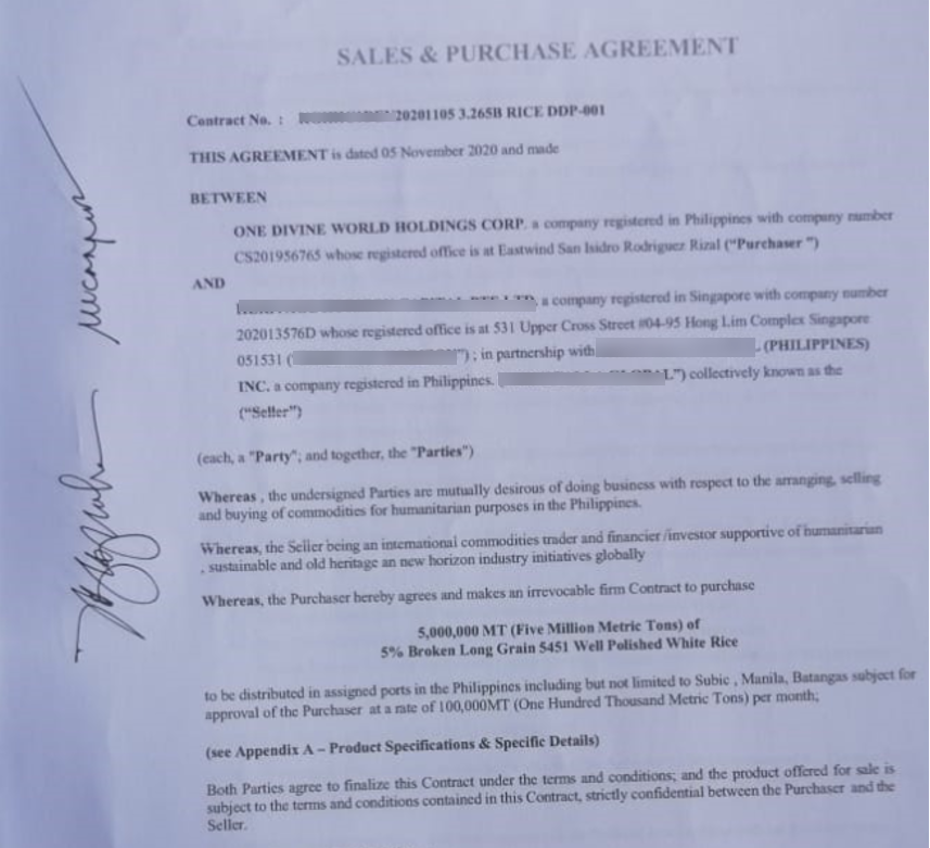 The Bankers Guarantee documents would be used to finance the purchase of the 5 million MT of rice from Vietnam, under her company One Divine World Holdings Corp.