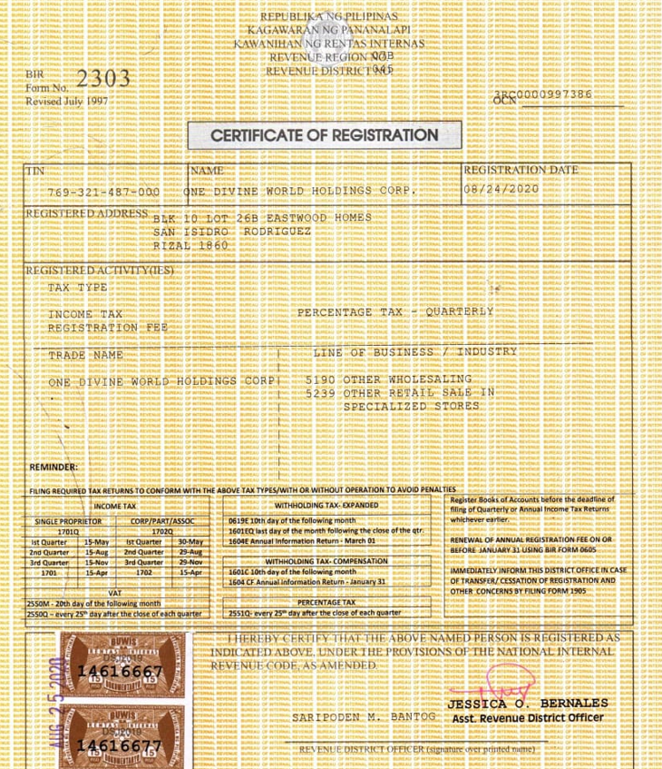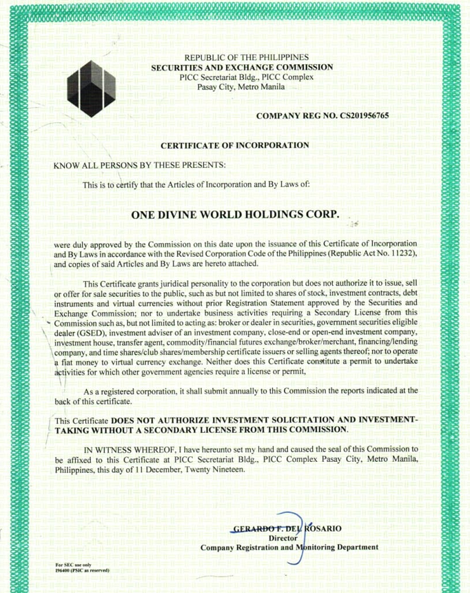 Below are more documents about the scam company One Divine World Holdings Corp, belonging to Rodenia Udaundo Carpio