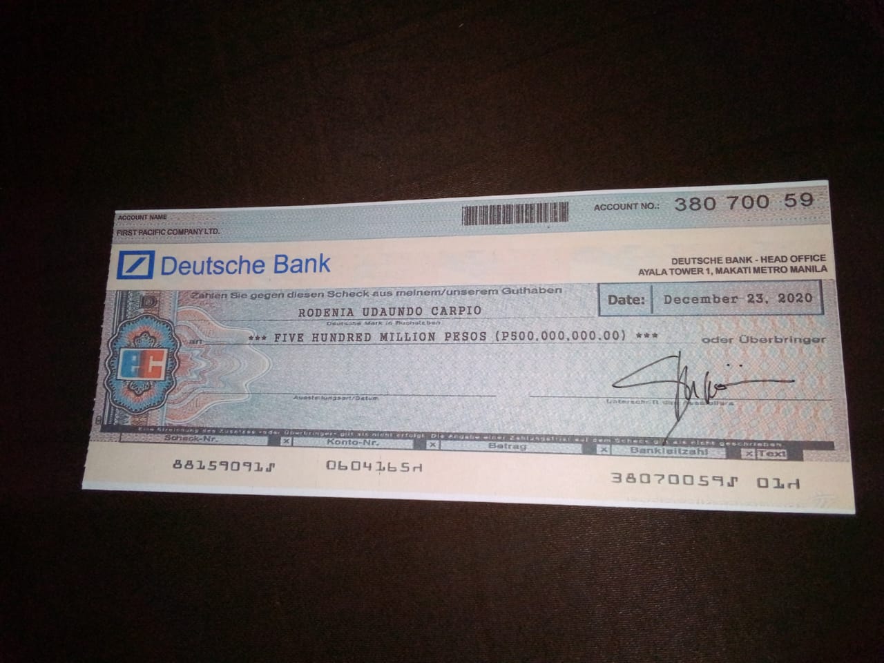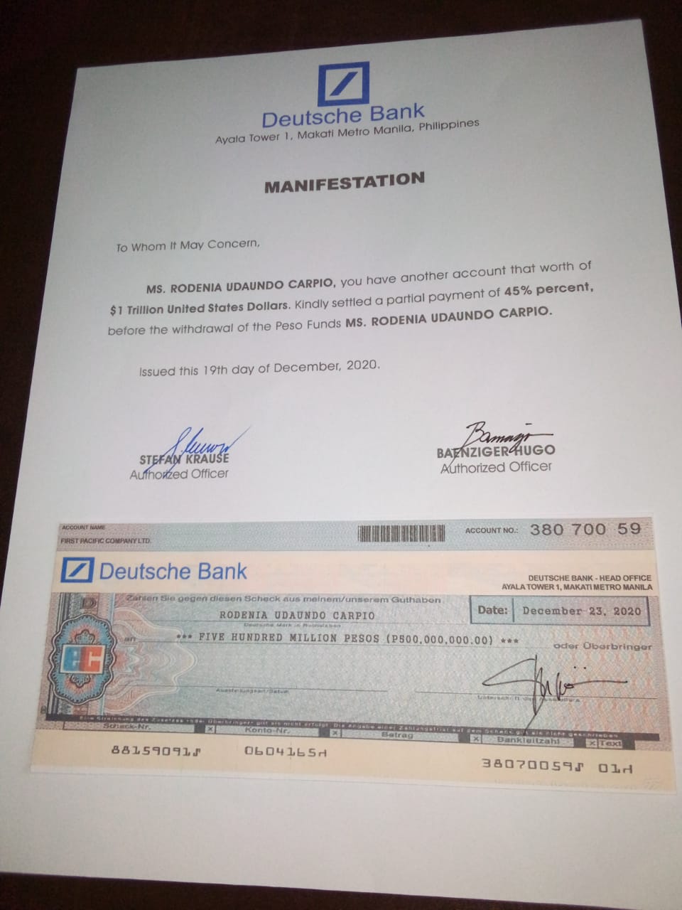 Rodenia Udaundo Carpio cashed out the cheque to cash, and promised us the 300,000 PHP would be handed to her lawyer to authorize the Bankers Guarantee documents from Deutsche Bank and China Bank within 3 days.